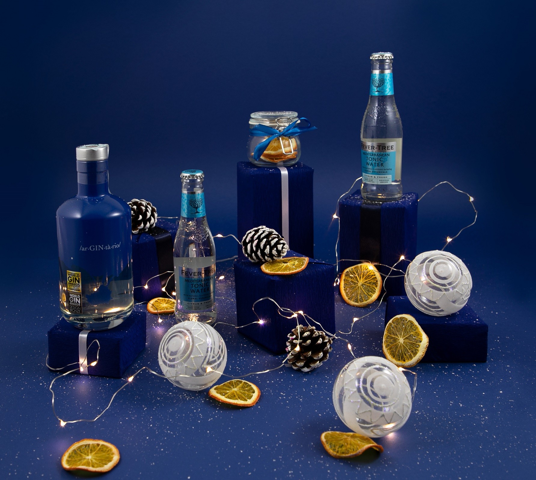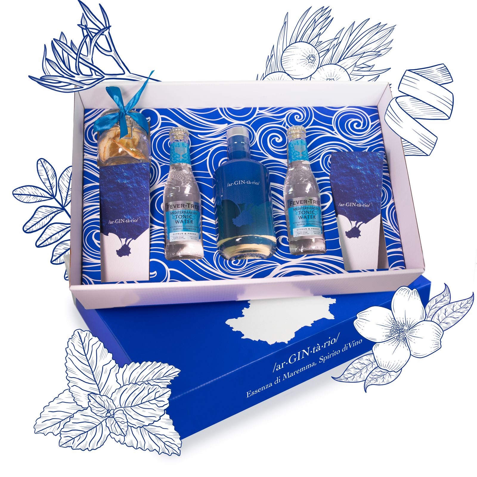 1 bt /ar٠GIN٠tà٠rio/ 0,5L. – 2 bt toniche fever tree mediterranean – vasetto in vetro con fette di arancia disidratata.